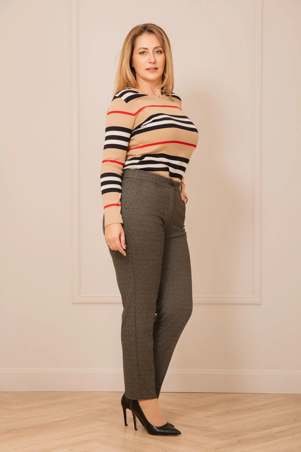 Ez a barna árnyalatú, magasderekú nadrág klasszikus eleganciát képvisel, amely tökéletes választás a mindennapokban és formálisabb alkalmakra is. Szabása egyenes vonalvezetésű, ami optikailag nyújtja a sziluettet, miközben kényelmes viseletet biztosít. A szövet hatású anyag diszkrét mintázattal gazdagított, amely kifinomult, időtálló megjelenést kölcsönöz. Könnyen kombinálható színes blúzokkal, kötött pulóverekkel vagy elegáns felsőkkel, így a ruhatár sokoldalú darabja lehet. Ez a modell a legnépszerűbb női nadrágfazonok közé tartozik – nem véletlenül, hiszen egyszerre stílusos és praktikus.