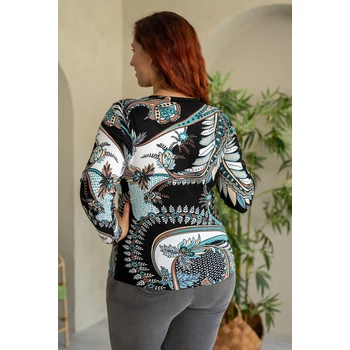 Egyedi hangulatot sugároz ez a fekete alapon kék és barna árnyalatokkal díszített, hosszú ujjú felső. A gazdag, ornamentikus mintázat igazán különlegessé teszi, miközben kényelmes szabásának köszönhetően a mindennapokban is remek választás. Anyaga lágyan követi az alakot, így egyszerre nőies és praktikus darab. Magasderekú farmernadrággal vagy elegánsabb nadrággal kombinálva modern és stílusos szettet alkothat. Ez a modell a legnépszerűbb női felsők közé tartozik – nem véletlenül, hiszen látványos mintája mellett kényelmes viseletet nyújt. Farmer Király tippje: Ha különleges, mégis kényelmes összeállítást szeretne, válassza szürke nadrággal és visszafogott kiegészítőkkel, hogy a felső mintája igazán érvényesüljön.