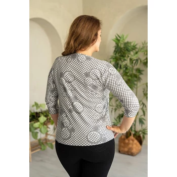 A modern minták kedvelőinek ajánljuk ezt a szürke-fehér kockás alapú, körmintákkal díszített felsőt. A játékos grafikus megoldás egyedi stílust kölcsönöz, miközben a 3/4-es ujjhossz kényelmes és praktikus viseletet biztosít a mindennapokban. Laza szabása nőies és kényelmes sziluettet ad, különösen magasderekú farmernadrággal párosítva. Ez a modell a legnépszerűbb női felsők közé tartozik – nem véletlenül, hiszen egyszerre különleges, mégis könnyen hordható darab, amely feldobja a hétköznapi öltözetet. Farmer Király tippje: Válassza egyszerű fekete nadrággal vagy farmerrel, hogy a grafikus minta igazán érvényesülni tudjon!