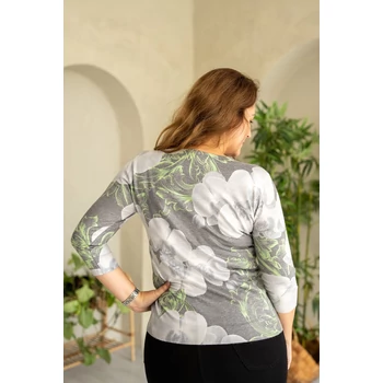 Frissességet és nőiességet sugároz ez a szürke alapon zöld és fehér virágmintás felső. A V-nyakú, háromnegyedes ujjú kialakítás kényelmes viseletet biztosít, miközben a virágminta elegánsan emeli ki az öltözetet. Kiváló választás mindennapi használatra és alkalmakra egyaránt, hiszen egyszerre modern és időtlen darab. Farmer Király tippje: Párosítsa fekete vagy fehér nadrággal, hogy a virágminta igazán ragyoghasson.