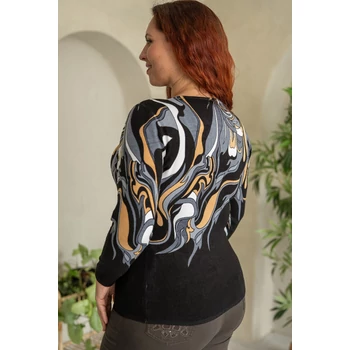 Igazi karakteres darab ez a fekete alapon hullámzó mintás felső. A szürke, fehér és okker árnyalatú motívumok modern, mégis elegáns megjelenést adnak, miközben az egyszerű szabás kényelmessé teszi a mindennapokban is. A hosszú ujjú kialakítás ideális választás hűvösebb napokra, akár munkába, akár hétköznapi viseletre. Farmer Király tippje: Hordja egyszínű nadrággal vagy szoknyával, hogy a minta igazán érvényesülhessen.