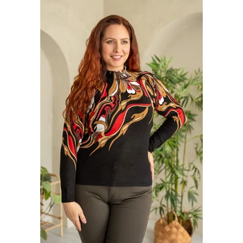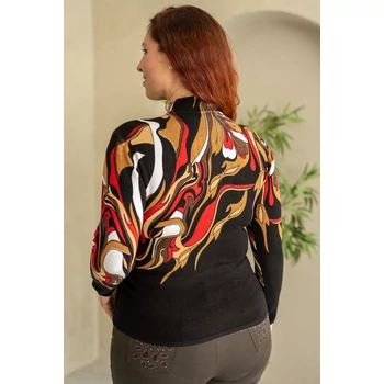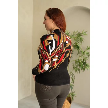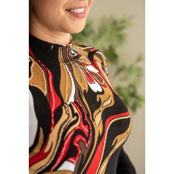 A fekete alapot látványos piros, arany és fehér minták díszítik, amelyek lendületesen futnak végig a felső elején és ujjain. A magasított nyakrész különleges eleganciát ad, miközben a karcsúsító hatású minta optikailag nyújtja a felsőtestet. Ez a darab egyszerre modern és karakteres, tökéletes választás, ha szeretne kitűnni a tömegből. Farmer Király tippje: Viselje egyszínű nadrággal vagy szoknyával, hogy a minta igazán érvényesülhessen – alkalmi megjelenéshez magas sarkúval, hétköznapra lapos talpú cipővel kombinálva.