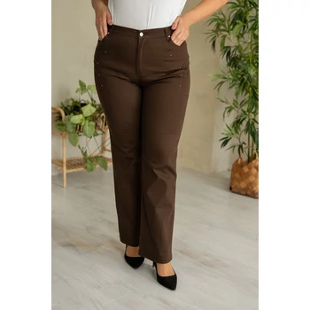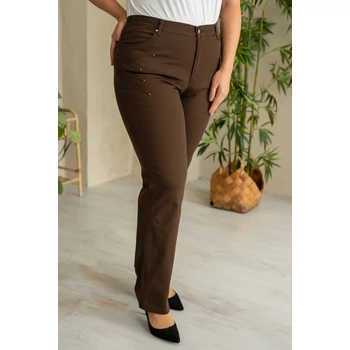Magasderekú, klasszikus szabású női nadrág, melynek barna árnyalata sokoldalúan kombinálható a ruhatár darabjaival. Különleges díszített hátsó zsebei apró strassz részletekkel teszik elegánssá és egyedivé. A kényelmes, mégis alakformáló szabás mindennapi viselethez és alkalmi megjelenéshez is tökéletes választás.