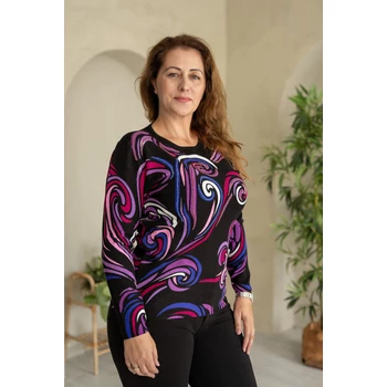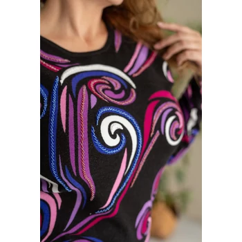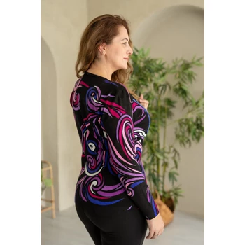 Karakteres, mégis nőies megjelenést kölcsönöz ez a fekete alapú, élénk mintás pulóver. A lila, pink és kék árnyalatok dinamikus hullámformái játékos, modern hatást teremtenek, miközben az anyag finoman követi a test vonalait. Kényelmes, puha tapintású darab, amely tökéletes választás a hűvösebb napokra, ha szeretne egy kis színt vinni az öltözékébe. Farmer Király tippje: Párosítsa egyszínű nadrággal – például feketével vagy sötétkékkel –, hogy a minta igazán érvényesülhessen, és a megjelenése elegánsan feltűnő maradjon.