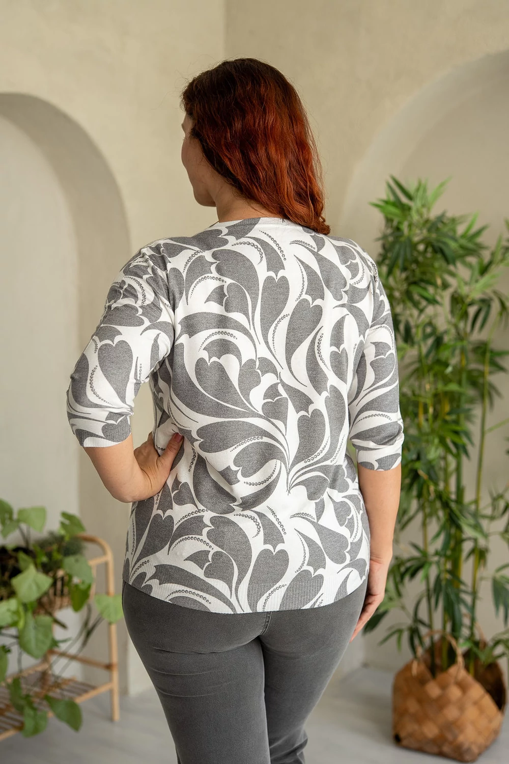 Elegáns és nőies megjelenést kínál ez a fehér alapon szürke mintás, finom strasszokkal díszített felső. A látványos, hullámzó mintázat különleges hatást kelt, miközben a 3/4-es ujjhossz kényelmes és praktikus viseletet biztosít. Laza szabása miatt kényelmes mindennapi darab, ugyanakkor a csillogó részleteknek köszönhetően alkalmakra is könnyedén beilleszthető a szettjeibe. Ez a modell a legnépszerűbb női felsők közé tartozik – nem véletlenül, hiszen eleganciát és kényelmet ötvöz egy darabban.